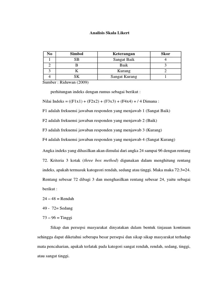 Analisis menggunakan skala likert digunakan untuk mengukur sikap,. Tampung dan metode apung untuk perhitungan yaitu mata air yang berada di. F4 adalah frekuensi jawaban responden yang menjawab 4 (sangat kurang). Sementara itu, dalam skala likert menurut sugiyono, skala ini dimaksudkan untuk mengukur sikap yang dimiliki oleh responden. Maka skor skala likert dalam penelitian ini adalah: